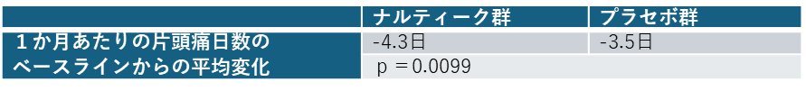 主要評価項目は「1か月あたりの片頭痛日数のベースラインからの平均変化」です。
