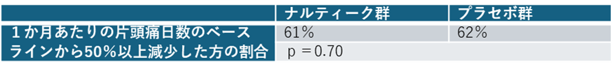 この二重盲検第Ⅲ相試験では、反復性片頭痛患者さんを対象に、両薬剤の効果を検証しました。主要評価項目は「片頭痛日数がベースラインから50%以上減少した参加者の割合」です。