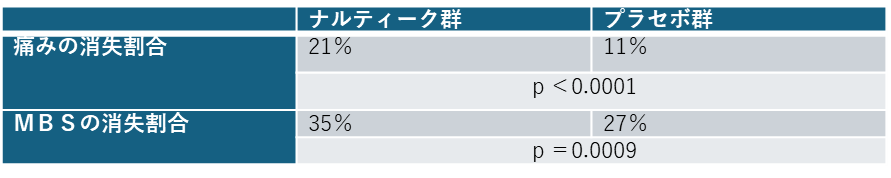 いずれもナルティーク群で有意な改善が認められ、急性期治療としての有効性が示されました。
