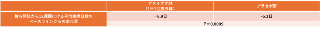 主要評価項目は「与開始から12週間における平均月間片頭痛日数のベースラインからの変化量」とされ、結果は以下の通りでした(代表としてアクイプタ群は1日1回投与群を掲載)。