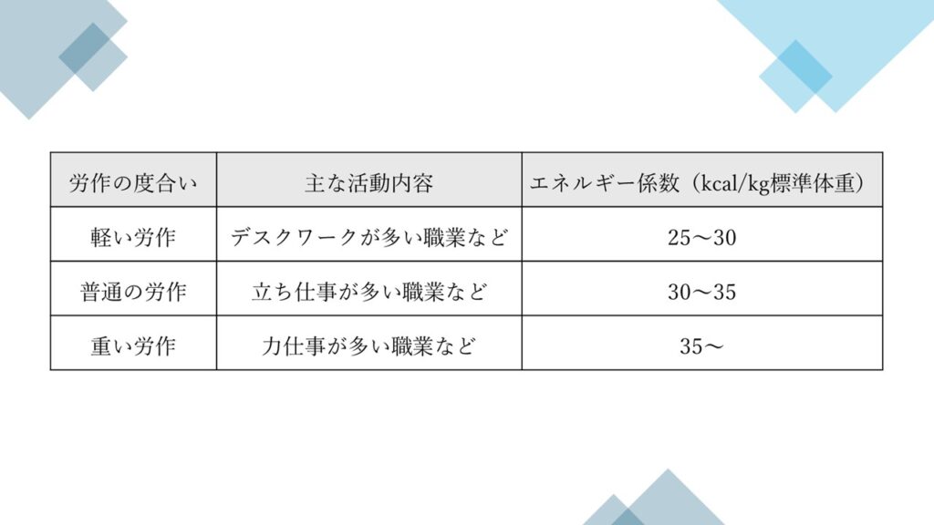 日々の活動によって消費されるエネルギーを係数として表したもの